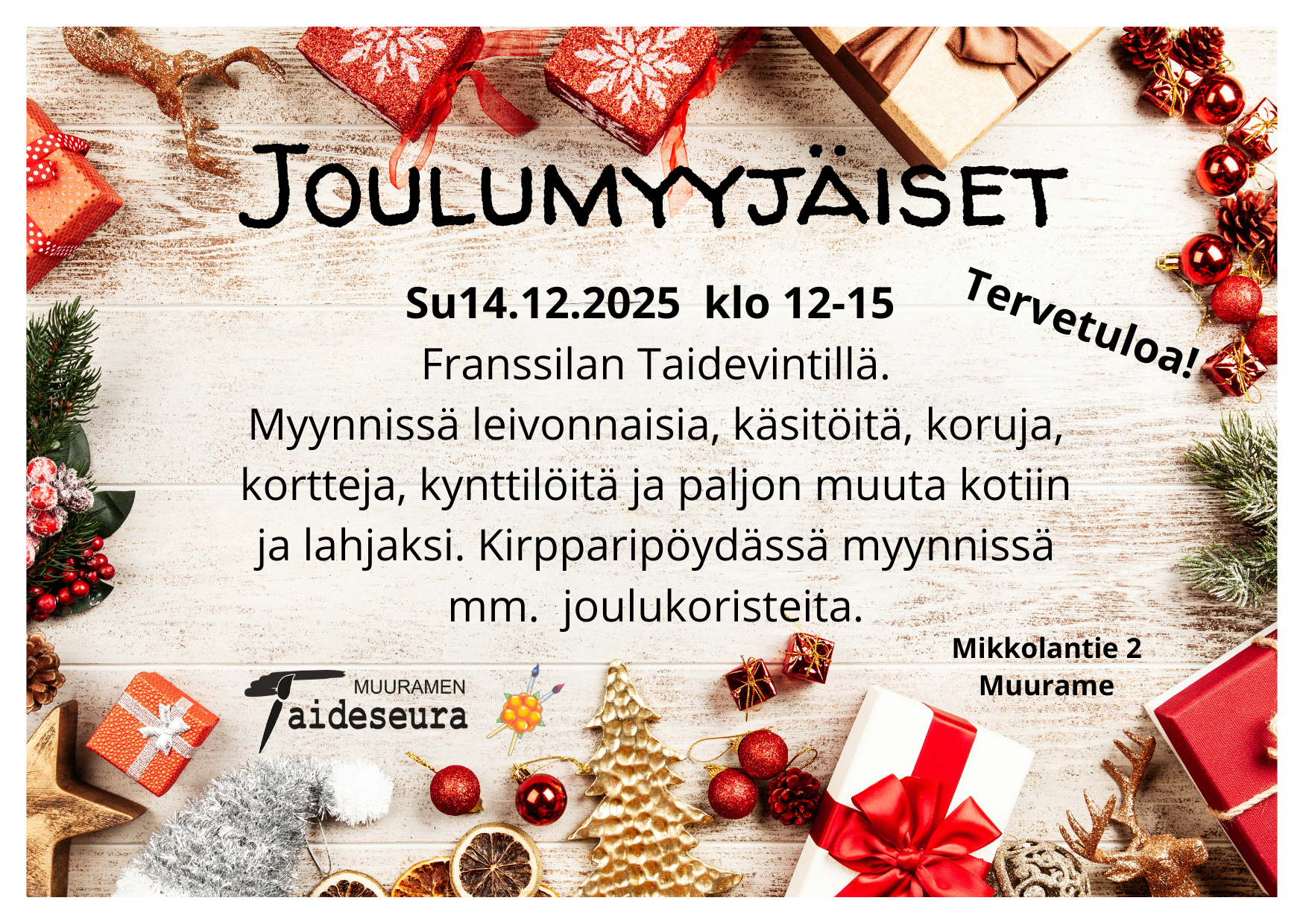 Sunnuntaina 14.12.2025 klo 12-15 Franssilan Taidevintillä myynnissä leivonnaisia, käsitöitä, koruja, kortteja, kynttilöitä ja paljon muuta kotiin ja lahjaksi. Kirpparipöydässä myynnissä mm. joulukoristeita ym. Tule tekemään ostoksia. Joulumyyjäisten yhteydessä on Franssilan pihassa ohjelmaa lapsille. Tonttujen kanssa luodaan joulun taikaa.